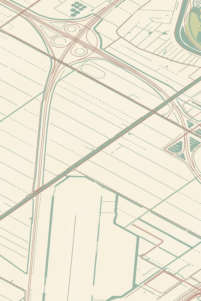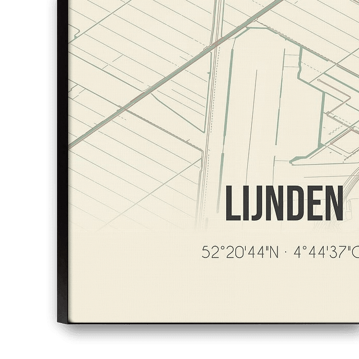 Retrokarte von Lijnden, gelegen in der Gemeinde Haarlemmermeer, Provinz Nordholland. Die Karte zeigt öffentliche Straßen, Wasserläufe (Seen, Bäche und Gräben) und Wälder in und um Lijnden. Darüber hinaus enthält die Karte die Koordinaten von Lijnden.