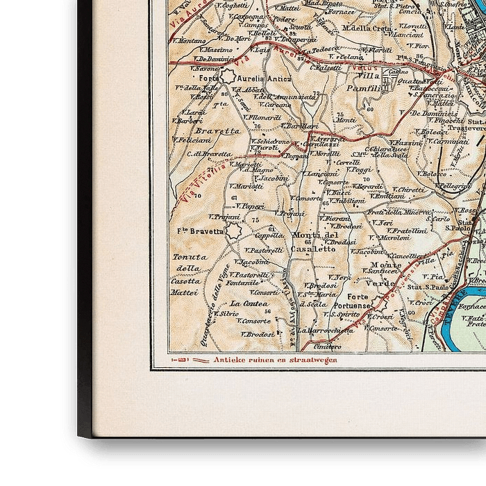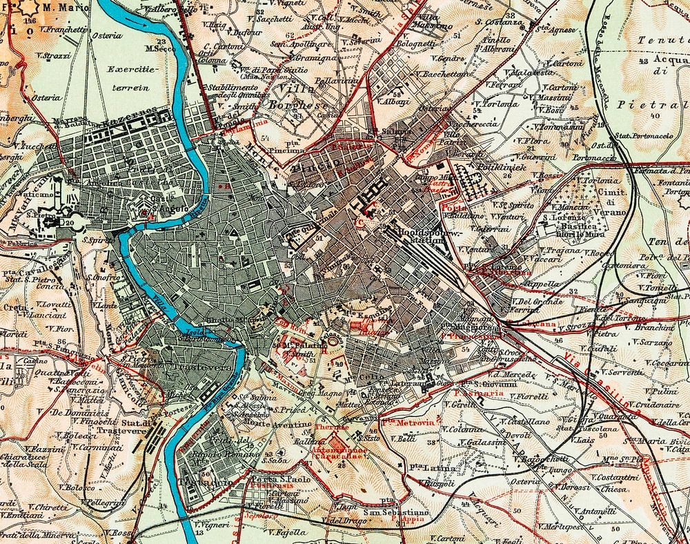 Diese antike Karte aus der Zeit um 1900 zeigt eine Karte von Rom und seiner Umgebung. Dieser Stadtplan ist in Farbe.