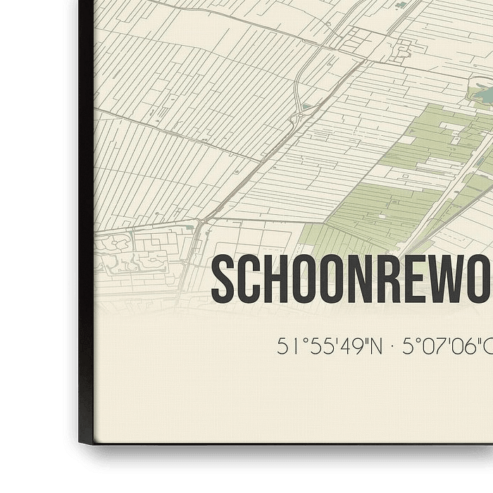Retrokarte von Schoonrewoerd, gelegen in der Gemeinde Vijfheerenlanden, Provinz Utrecht. Die Karte zeigt öffentliche Straßen, Wasserläufe (Seen, Bäche und Gräben) und Wälder in und um Schoonrewoerd. Darüber hinaus enthält die Karte die Koordinaten von Schoonrewoerd.