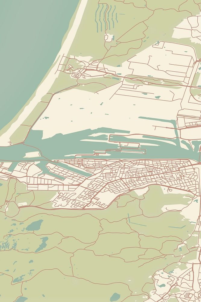 Retrokarte von Velsen-Noord, gelegen in der Randstad, in der Gemeinde Velsen, Provinz Nordholland. Die Karte zeigt öffentliche Straßen, Wasserläufe (Seen, Bäche und Gräben) und Wälder in und um Velsen-Noord. Darüber hinaus enthält die Karte die Koordinaten von Velsen-Noord.