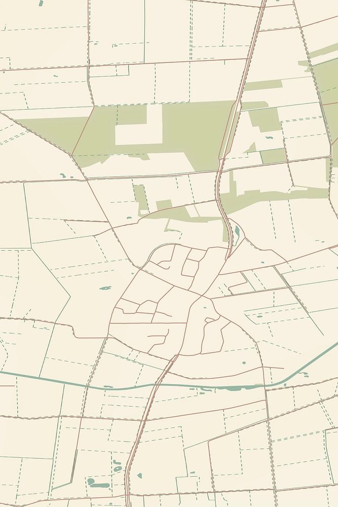 Retrokarte von Vorstenbosch, gelegen in der Gemeinde Bernheze, Provinz Nordbrabant. Die Karte zeigt öffentliche Straßen, Wasserläufe (Seen, Bäche und Gräben) und Wälder in und um Vorstenbosch. Darüber hinaus enthält die Karte die Koordinaten von Vorstenbosch.