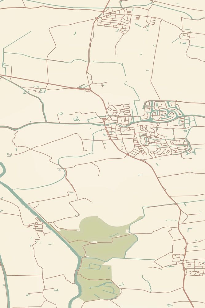 Retrokarte von Winsum, gelegen in der Gemeinde Het Hogeland, Provinz Groningen. Die Karte zeigt öffentliche Straßen, Wasserläufe (Seen, Bäche und Gräben) und Wälder in und um Winsum. Darüber hinaus enthält die Karte die Koordinaten von Winsum.
