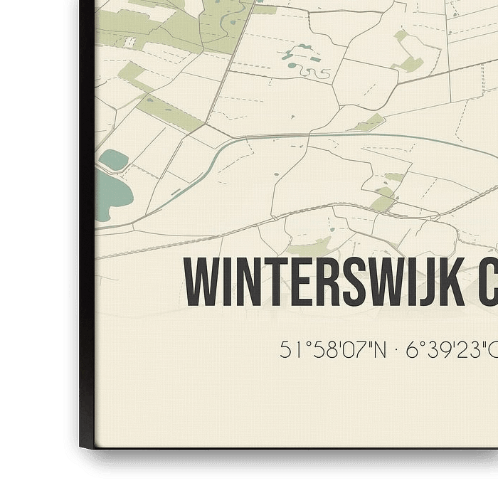Retrokarte von Winterswijk Corle, gelegen in der Achterhoek, in der Gemeinde Winterswijk, Provinz Gelderland. Die Karte zeigt öffentliche Straßen, Wasserläufe (Seen, Bäche und Gräben) und Wälder in und um Winterswijk Corle. Darüber hinaus enthält die Karte die Koordinaten von Winterswijk Corle.