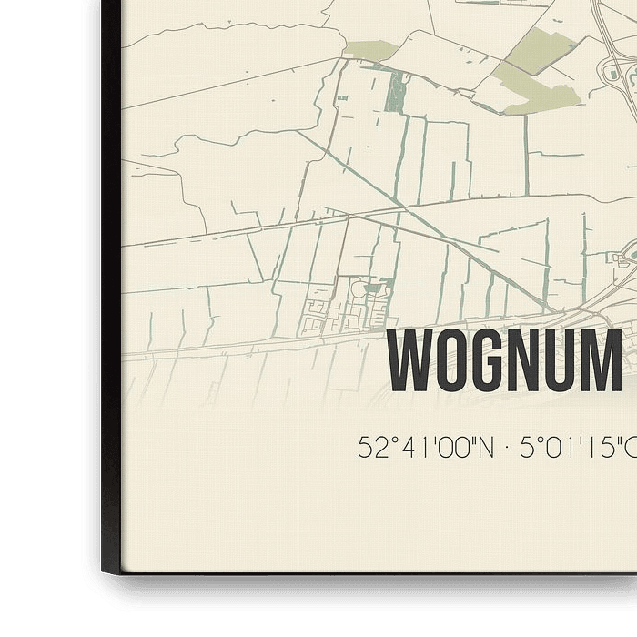 Retrokarte von Wognum, gelegen in der Gemeinde Medemblik, Provinz Nordholland. Die Karte zeigt öffentliche Straßen, Wasserläufe (Seen, Bäche und Gräben) und Wälder in und um Wognum. Darüber hinaus enthält die Karte die Koordinaten von Wognum.