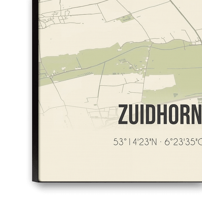 Retrokarte von Zuidhorn, gelegen in der Gemeinde Westerkwartier, Provinz Groningen. Die Karte zeigt öffentliche Straßen, Wasserläufe (Seen, Bäche und Gräben) und Wälder in und um Zuidhorn. Darüber hinaus zeigt die Karte die Koordinaten von Zuidhorn.