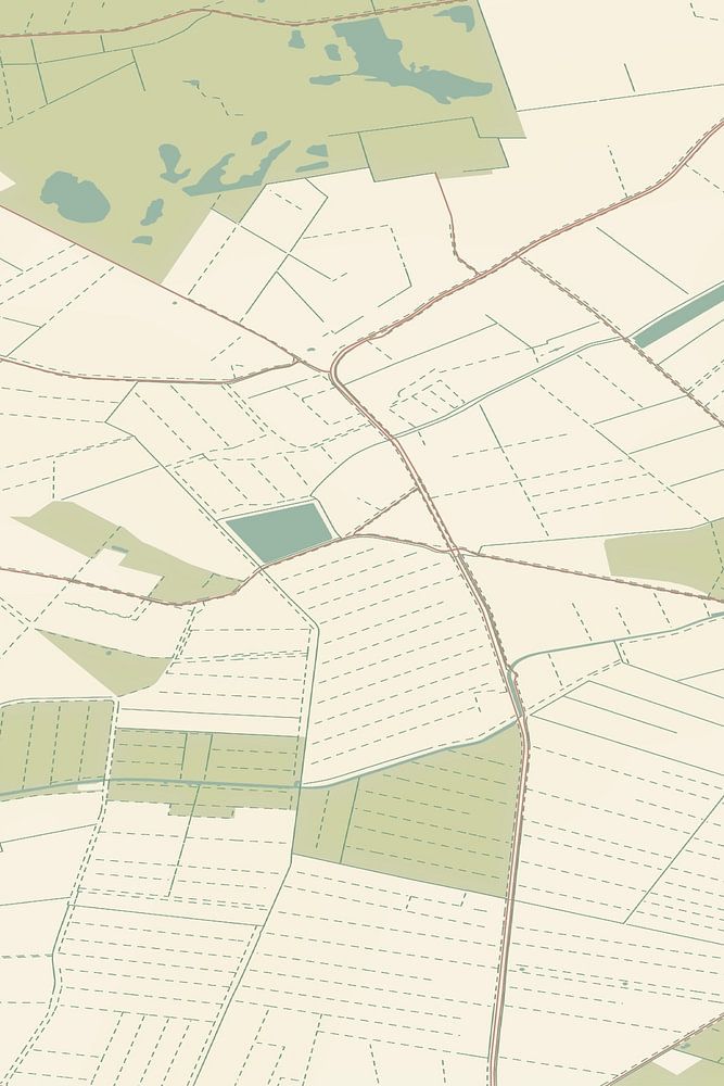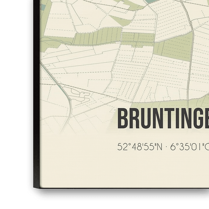 Retrokarte von Bruntinge, gelegen in der Gemeinde Midden-Drenthe, Provinz Drenthe. Die Karte zeigt öffentliche Straßen, Wasserläufe (Seen, Bäche und Gräben) und Wälder in und um Bruntinge. Darüber hinaus enthält die Karte die Koordinaten von Bruntinge.