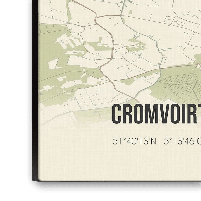 Retrokarte von Cromvoirt, gelegen in der Gemeinde Vught, Provinz Nordbrabant. Die Karte zeigt öffentliche Straßen, Wasserläufe (Seen, Bäche und Gräben) und Wälder in und um Cromvoirt. Darüber hinaus enthält die Karte die Koordinaten von Cromvoirt.