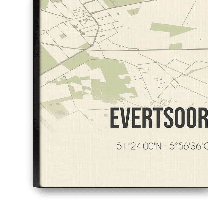 Retrokarte von Evertsoord, gelegen in der Gemeinde Horst aan de Maas, Provinz Limburg. Die Karte zeigt öffentliche Straßen, Wasserläufe (Seen, Bäche und Gräben) und Wälder in und um Evertsoord. Darüber hinaus enthält die Karte die Koordinaten von Evertsoord.