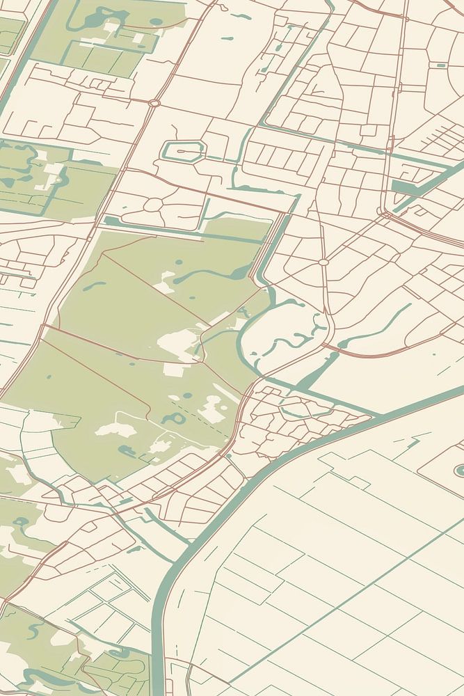 Retrokarte von Heemstede, gelegen in der Randstad, in der Gemeinde Heemstede, Provinz Nordholland. Die Karte zeigt öffentliche Straßen, Wasserläufe (Seen, Bäche und Gräben) und Wälder in und um Heemstede. Darüber hinaus enthält die Karte die Koordinaten von Heemstede.