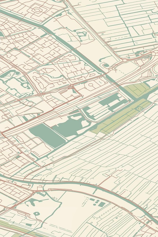 Retrokarte von Leiderdorp, gelegen in der Randstad, in der Gemeinde Leiderdorp, Provinz Südholland. Die Karte zeigt öffentliche Straßen, Wasserläufe (Seen, Bäche und Gräben) und Wälder in und um Leiderdorp. Darüber hinaus zeigt die Karte die Koordinaten von Leiderdorp.