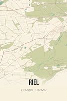 Retrokarte von Riel, gelegen in der Gemeinde Goirle, Provinz Nordbrabant. Die Karte zeigt öffentliche Straßen, Wasserläufe (Seen, Bäche und Gräben) und Wälder in und um Riel. Darüber hinaus enthält die Karte die Koordinaten von Riel.