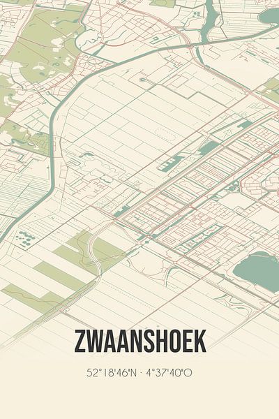 Retrokarte von Zwaanshoek, gelegen in der Gemeinde Haarlemmermeer, Provinz Nordholland. Die Karte zeigt öffentliche Straßen, Wasserläufe (Seen, Bäche und Gräben) und Wälder in und um Zwaanshoek. Darüber hinaus enthält die Karte die Koordinaten von Zwaanshoek.