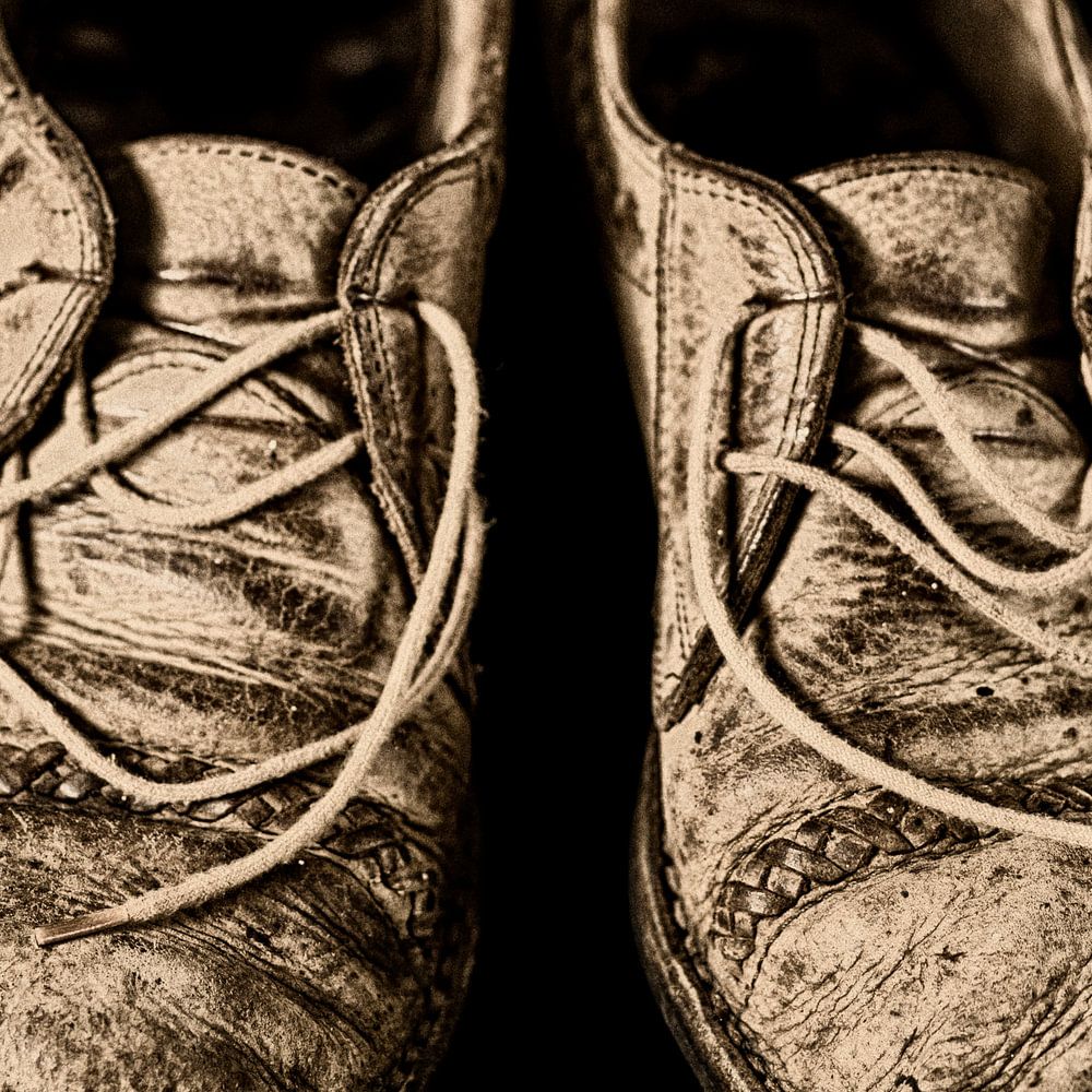 Serie alter Schuhe. Abgenutzte Schuhe, die eine Geschichte zu erzählen scheinen. Wer war derjenige, der die Schuhe getragen hat, und wo sind sie alle gewesen?
