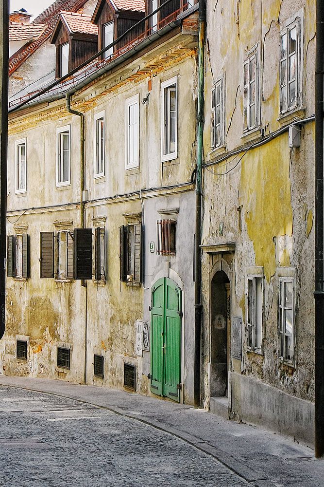 Malerischen Straße mit markanten grünen Tür in Ljubljana, der Hauptstadt Sloweniens