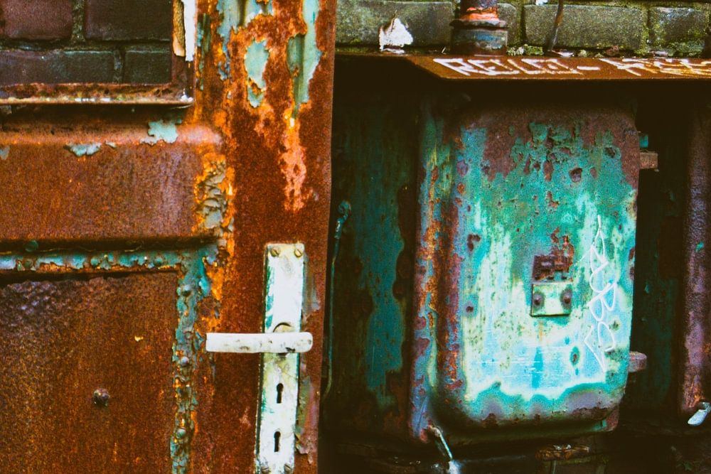 Rostige Tür eine alte Steinmauer verwitterte Ziegel. Alte Sicherungskästen mit dicken Stromkabeln. Das Bild strahlt Geschichte, Charakter und Leben aus.