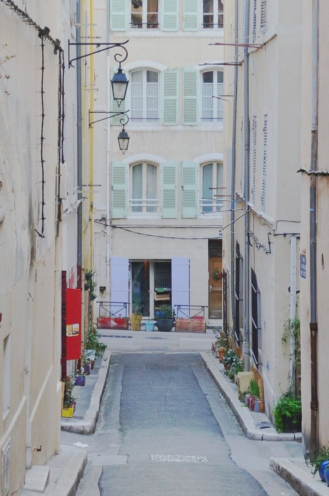 Eine kleine Gasse in der südfranzösischen Stadt Marseille mit einem hängenden Fahrrad, ein paar Pflanzen und dem Leben eines Boheme-Viertels.
