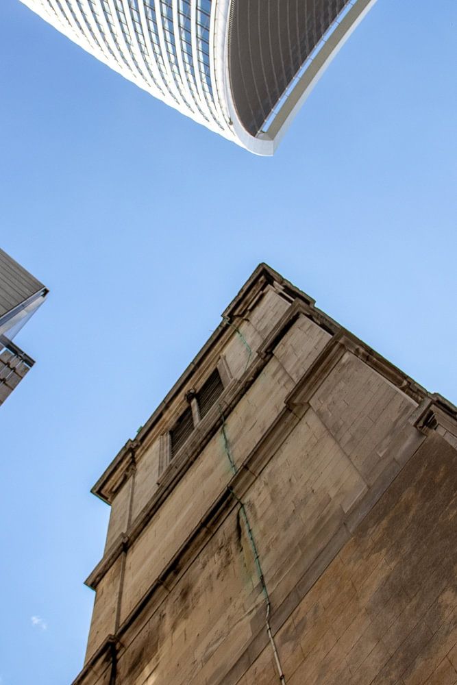 Foto von einem alten Kirchturm und modernen Wolkenkratzern nebeneinander. Das Foto wurde von unten auf Straßenniveau in London, UK, aufgenommen.