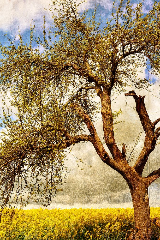 Alter morscher Baum vor einem Rapsfeld mit blauem Himmelund feiner Textur