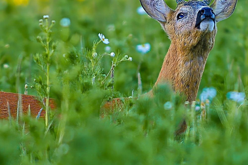 Alter Rehbock steht an einem Sommer Morgen auf einer Wiese mit Blumen und Kräutern