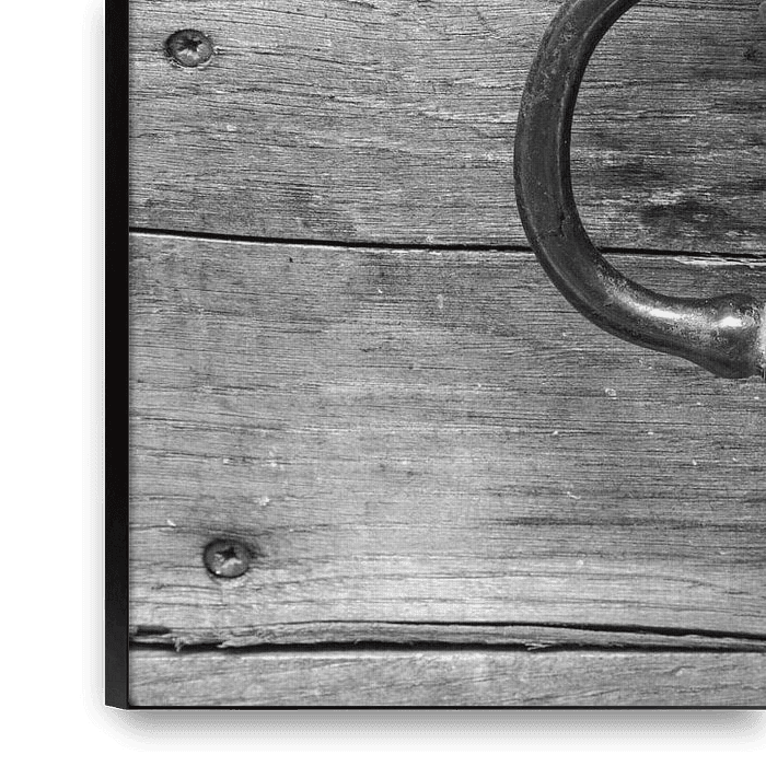Bestelle dieses Stilleben Alter Türklopfer an Holztür in Schwarzweiß von Fartifos als Reproduktion auf Leinwand, Alu-Dibond, als Poster, Fototapete oder Acrylglasbild.
