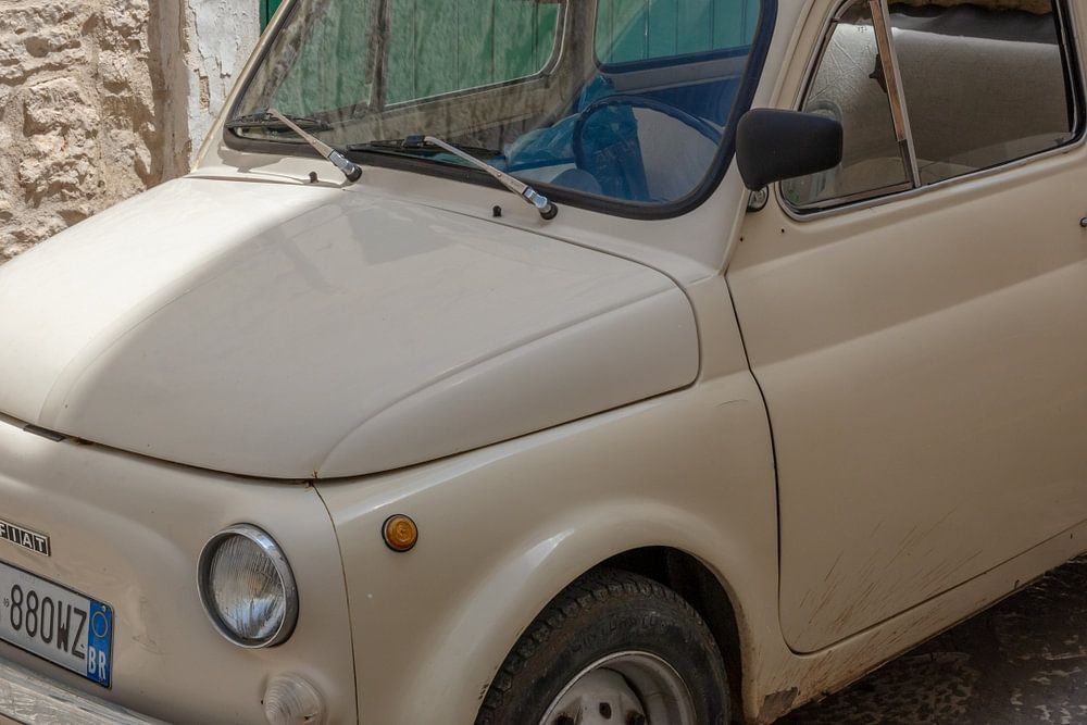 Alter beiger Fiat 500 in der Innenstadt von Ostuni, Italien