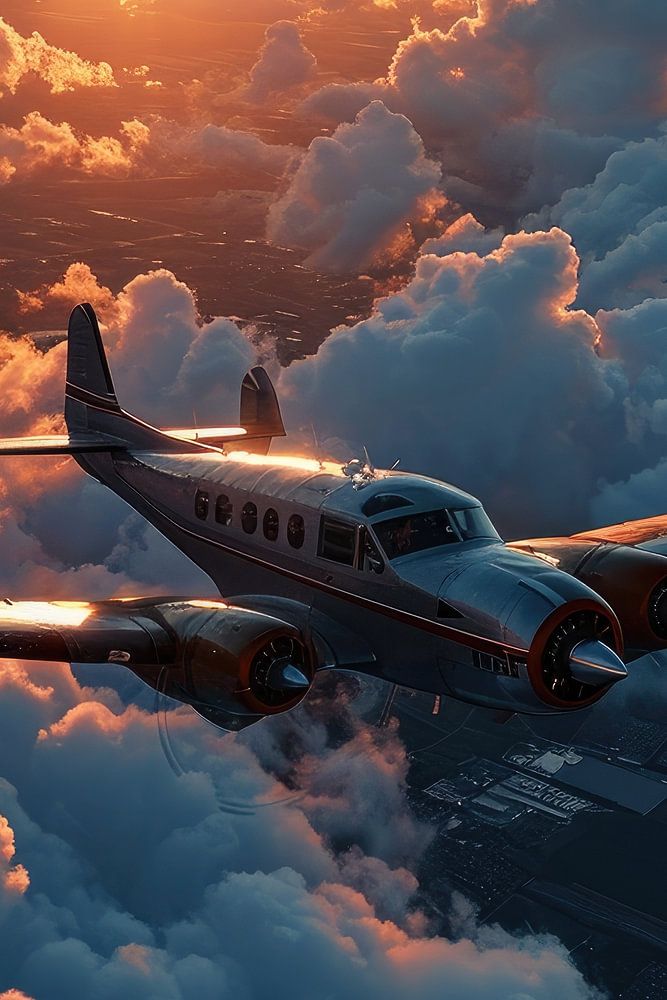Hoch über der Erde schwebt ein uraltes Flugzeug, dessen alternde Flügel in warme Orangetöne gehüllt sind, die den Himmel umarmen. Dieses zeitlose Flugzeug ist eine Hommage an vergangene Epochen der Luftfahrtgeschichte und durchbricht den modernen Horizont mit einem Hauch von Nostalgie. Seine Triebwerke summen wie eine Melodie aus einer fernen Vergangenheit, während es sich elegant durch die Wolken bewegt, ein Tanz, der an längst vergangene Tage erinnert. Das alte Flugzeug trägt die Spuren endloser Reisen und Abenteuer; jede Delle und jeder Kratzer erzählt eine Geschichte von vergangenen Flugreisen. Während es sich in die Lüfte erhebt, weckt es Erinnerungen an eine Zeit, als der Himmel noch unerforschte Grenzen bot und das Fliegen ein wahr gewordener Traum war.