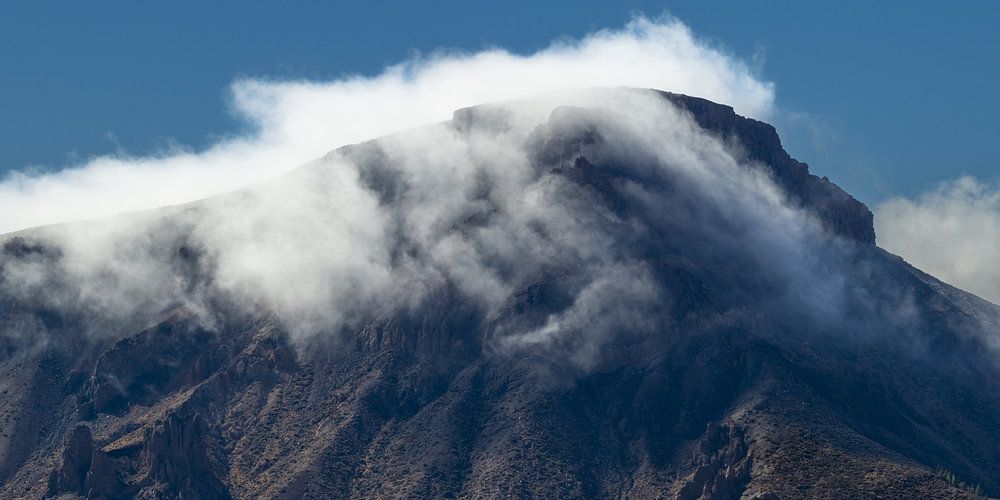 Über den endlosen Weiten des Teide-Nationalparks erhebt sich ein überwältigendes Panorama, das die karge Schönheit der Vulkanlandschaft auf eine fast unwirkliche Art einfängt. Das Lavagestein, tiefschwarz und zerklüftet, erstreckt sich in alle Richtungen und wirkt wie eine Landschaft aus einer anderen Welt, während der Alto de Guajara mit einer imposanten Höhe von 3.718 Metern majestätisch über der Szenerie thront. Die dichten Wolkenbänder, die sanft über die Gipfelregion hinwegziehen, schaffen ein wechselvolles Spiel von Licht und Schatten, das die gesamte Szenerie in ein magisches Licht taucht. Die Wolken umspielen den Gipfel, ziehen in langsamen, wellenartigen Bewegungen und lassen ihn teilweise verschwinden, nur um ihn im nächsten Augenblick wieder preiszugeben.