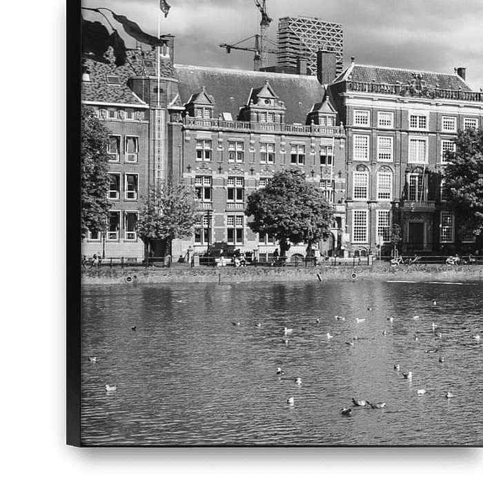 Dieses Schwarz-Weiß-Panoramafoto bietet einen ruhigen und doch beeindruckenden Blick auf die Parlamentsgebäude am Hofvijver in Den Haag, einschließlich des berühmten Torentje - dem Arbeitszimmer des Ministerpräsidenten. Die Wahl von Schwarz und Weiß schafft eine zeitlose Darstellung eines Ortes, der eine zentrale Rolle in der…