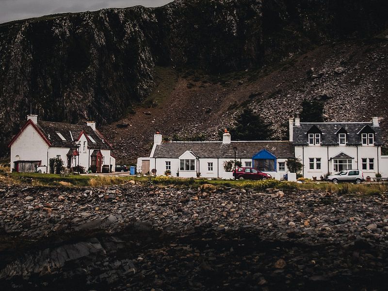 Am Fuße einer steilen, felsigen Bergwand liegen ein paar weiße Häuser dicht beieinander, als suchten sie gemeinsam Schutz. Der Berg ragt schweigend über dem Dorf empor und lässt wenig Raum für Zweifel, wer hier die Oberhand hat. Die Steine im Vordergrund, rau und unregelmäßig, bilden eine natürliche Grenze zwischen Mensch und…