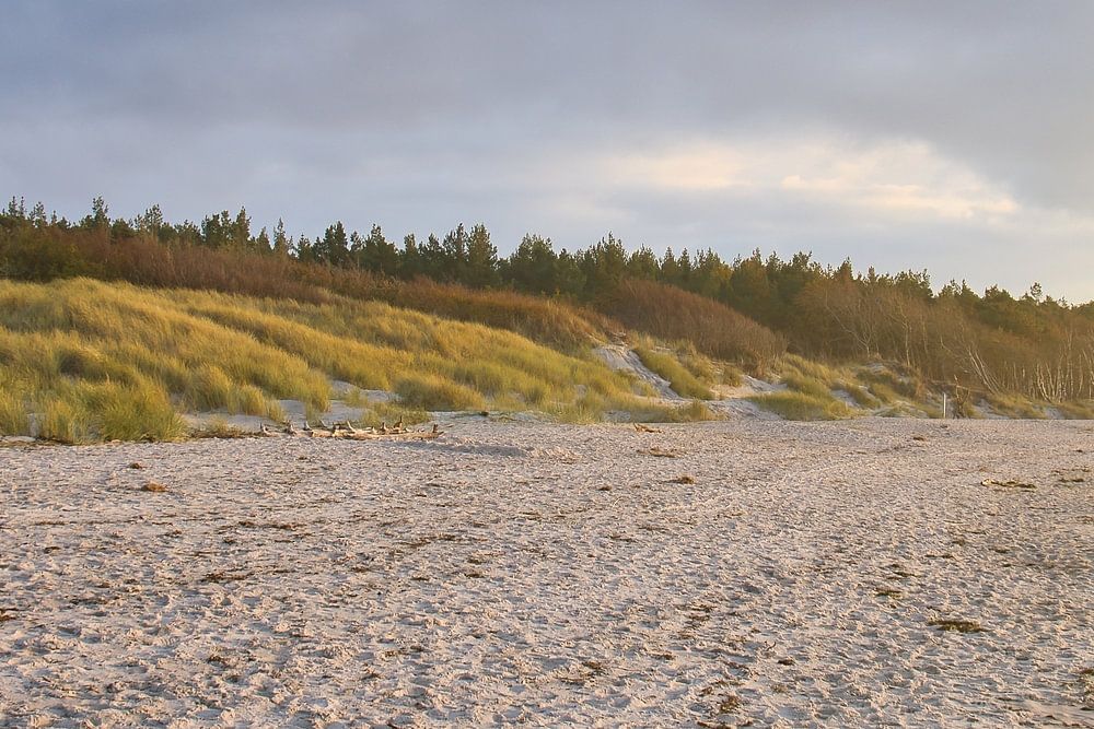 Am Sandstrand der Ostseeküste. Wellen die vom Meer auf die Küste rollen. Sandstrand und Wolken. Landschaftsaufnahme am Meer