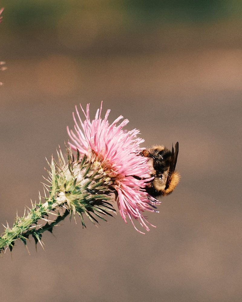 Ein Moment aus der stillen Symphonie des Lebens – eingefangen im Zusammenspiel von Blüte und Biene. Die rosafarbenen Köpfchen der Distel recken sich dem Licht entgegen, widerspenstig und doch anmutig. Ihre feinen, stacheligen Strukturen wirken wie eine Krone aus Widerstandskraft – ein Zeichen dafür, dass auch das Unangepasste seine eigene Schönheit trägt.
