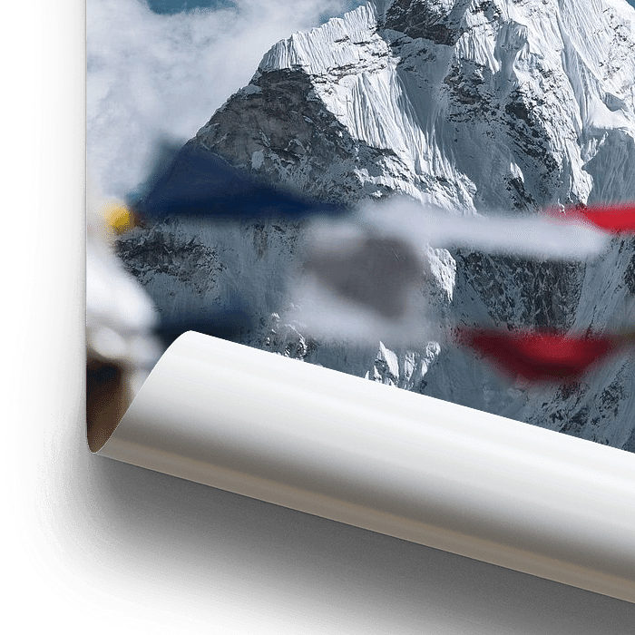 Der Gipfel des Ama Dablam (6812m) in Nepal, mit den berühmten Gebetsfahnen im Vordergrund.
