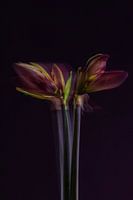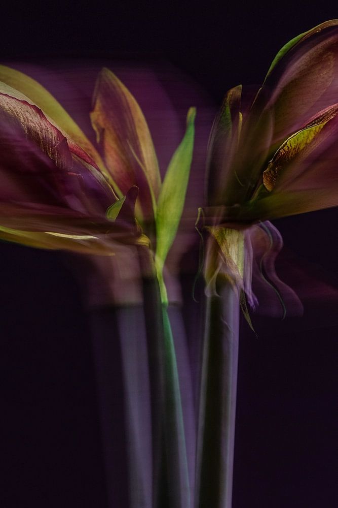 Eine farbenfrohe Doppelbelichtung mit Bewegung von zwei Amaryllis vor einem dunklen Hintergrund.