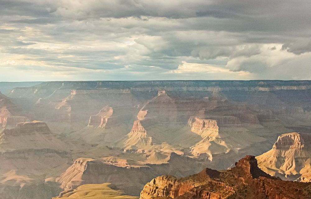 Dunkle Wolken versammeln sich über dem Grand Canyon. Die letzten Sonnenstrahlen werfen ein schönes Licht in den Canyon.