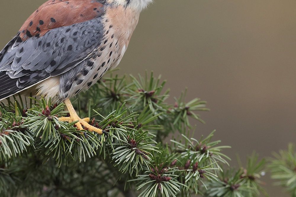 Der Amerikanische Turmfalke (Falco sparverius), die kleinste Falkenart Nordamerikas, ist ein anmutiger Raubvogel mit einem unverwechselbaren Aussehen. Er hat einen kompakten Körperbau, scharfe Flügel und eine charakteristische Färbung. Die Männchen haben einen blaugrauen Kopf und Flügel, einen rostroten Rücken und einen Schwanz mit einem schwarzen Abschlussband. Die Weibchen sind überwiegend braun gestreift.