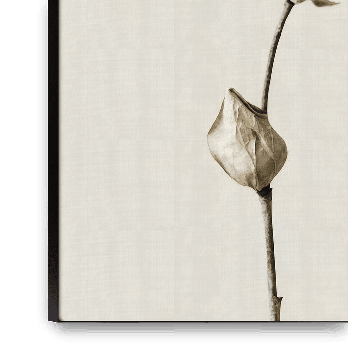Eine zarte, stimmungsvolle Blume, eingefangen in gedämpften Elfenbein- und tiefen Violetttönen. Ihre sanft gewellten Blütenblätter und ihre subtile Textur schaffen ein raffiniertes, minimalistisches botanisches Porträt vor einem neutralen Hintergrund.