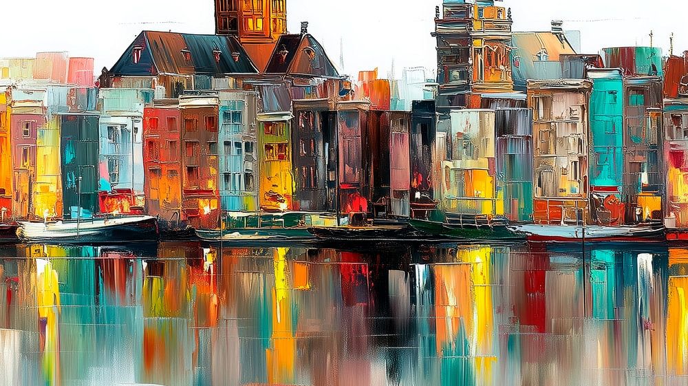 Diese beeindruckende Amsterdamer Stadtansicht zeigt die charakteristischen Kanäle mit ihren bunten Giebelhäusern in voller Pracht. Die typisch holländischen Gebäude erstrahlen in einem lebendigen Spektrum von Gelb, Orange, Türkis, Rot und Violett, während die historischen Kirchtürme mit ihren markanten Kuppeln die Skyline dominieren. Der Künstler hat mit kräftigen Pinselstrichen einen expressiven Ölmalerei-Stil geschaffen, der die niederländische Architektur fast zum Leben erweckt. Besonders faszinierend sind die perfekten Spiegelungen im ruhigen Kanalwasser, die wie ein zweites Gemälde wirken und die Farbintensität verdoppeln. Die warmen und kühlen Töne harmonieren wunderbar miteinander und schaffen die typische romantische Atmosphäre Amsterdams.