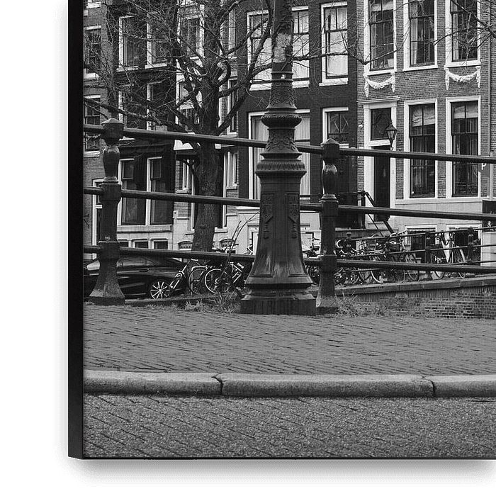Bestelle das Foto Amsterdam Architektur, schwarz und weiß. von Lorena Cirstea als Reproduktion auf Leinwand, Alu-Dibond, als Poster, Fototapete oder Acrylglasbild.