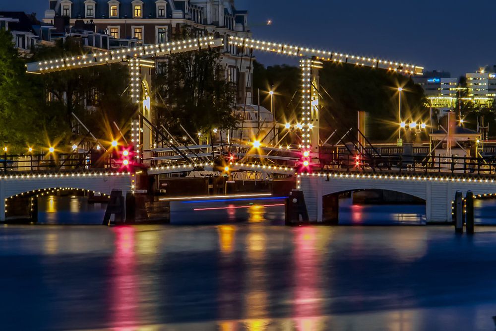 Die Ziehbrücke Magere Brug über der Amstel, prächtig beleuchtet zur Blauen Stunde