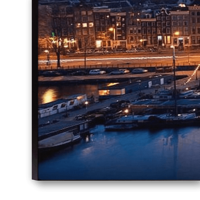 Panorama Abendaufnahme des Zentrums von Amsterdam von einem hohen Aussichtspunkt aus. Wir sehen die Prins Hendrik Kade, die St. Nicolaas Kirche und den umliegenden Bahnhof. Reflektionen im Wasser. Blick über die beleuchtete Stadt.
