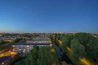 Diese Arbeit zeigt ein Panorama der Stadt Amsterdam während der blauen Stunde. Im Vordergrund ist der Sloterhof-Komplex, von dem aus das Foto aus einem Fenster im 11. Stock aufgenommen wurde.