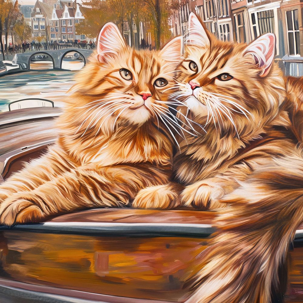 Zwei Katzen genießen die Fahrt auf einem Boot in den Amsterdamer Grachten.