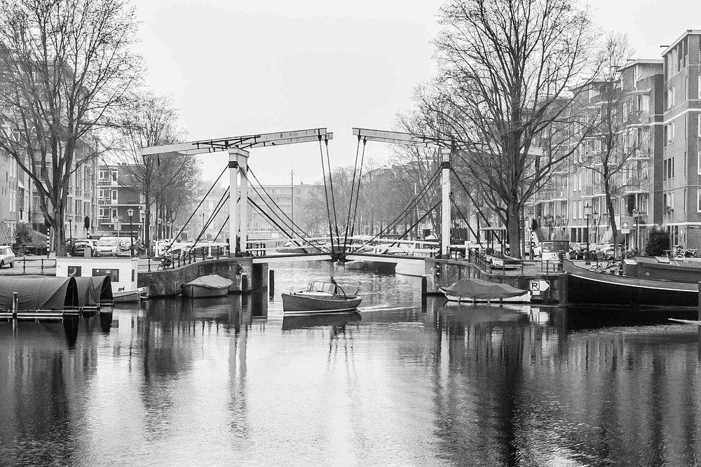 Grachten von Amsterdam in den Niederlanden. Schwarz-Weiß-Foto. Mann segelt mit Boot durch die Grachten von Amsterdam