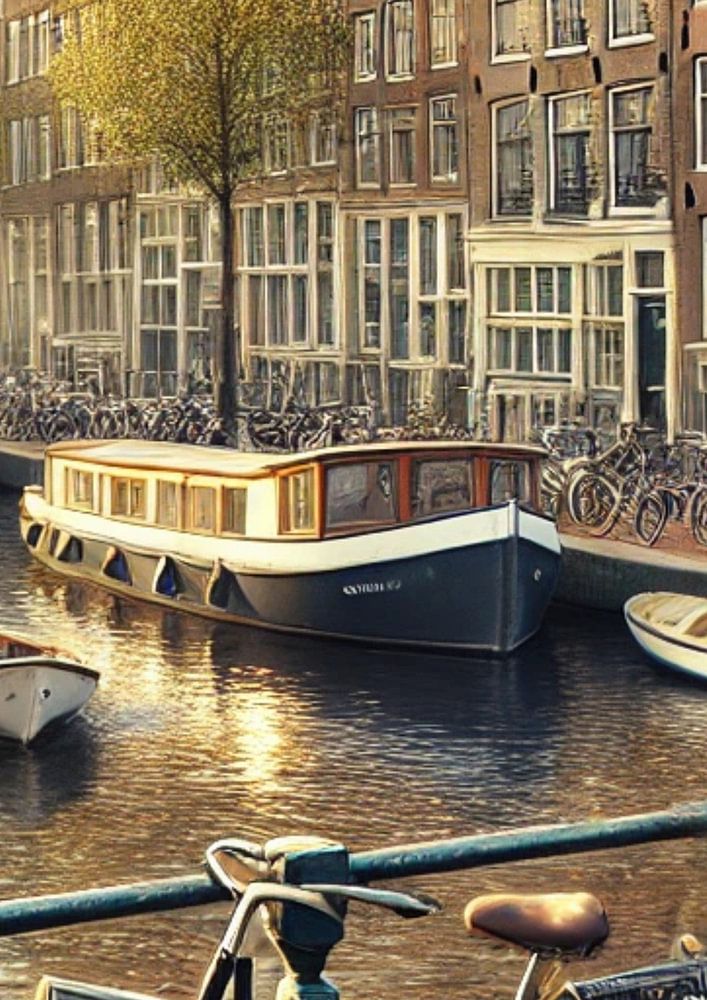 Schöne Amsterdamer Grachten-Szene mit einem Fahrradboot und den Grachtenhäusern!