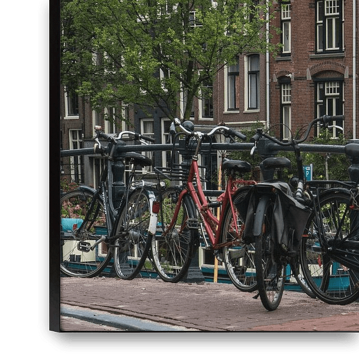 Amsterdamse Grachtenhuizen in kleur, de huizen vind je typisch aan de Amsterdamse grachten, Ook herkenbaar aan Nederland zijn de fietsen aan de brugleuning. Voor velen een herkenbaar taafereel.