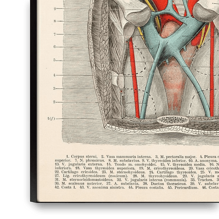 Antiker medizinischer Druck, der das Innere des Brustkorbs im Querschnitt zeigt. Schöne Vintage-Farben in diesem sehr detaillierte Platte mit vollständiger Beschreibung der Teile angegeben.