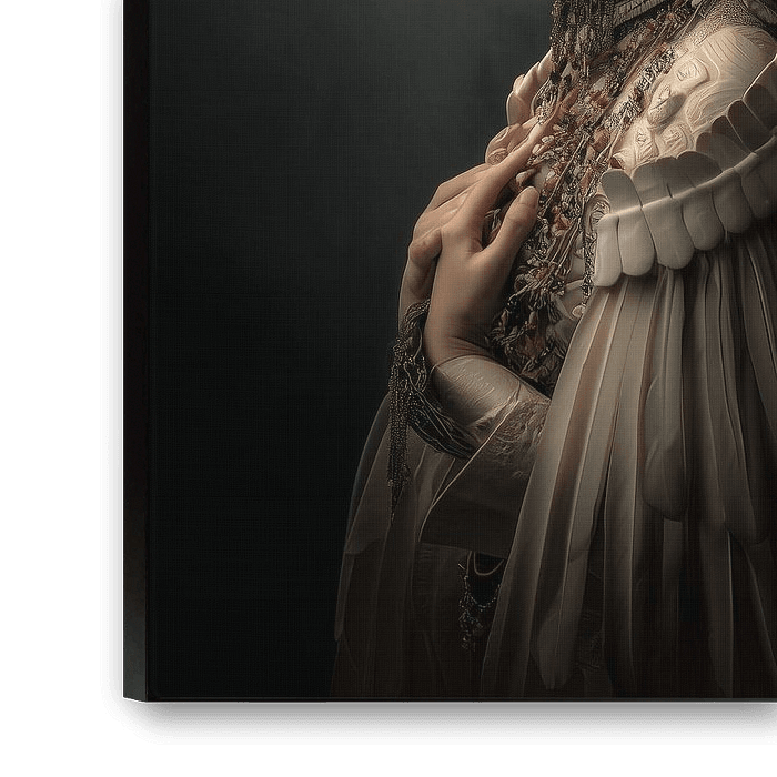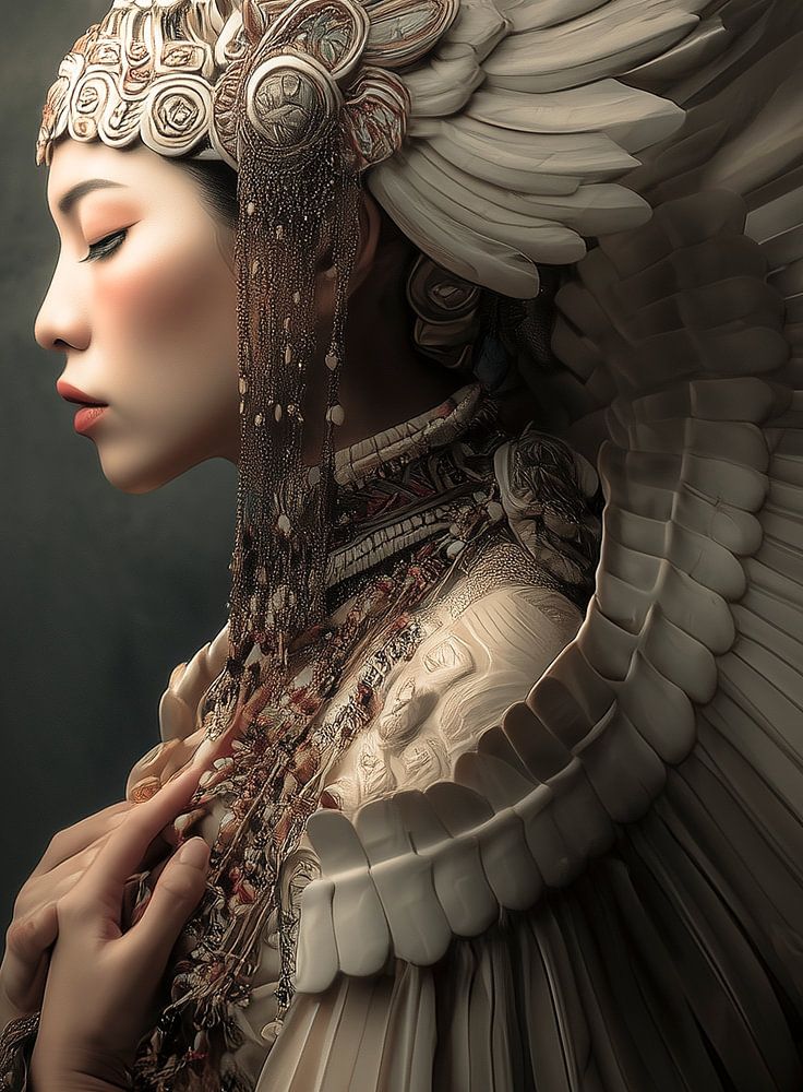 Diese beeindruckende Fotografie einer aztekischen Frau verbindet meisterhaft die Kunst der Mythologie und des Porträts. Der Schwerpunkt des Bildes liegt auf der matten Farbpalette, die eine mythische Eleganz und ein Aussehen wie aus dem 17. Jahrhundert erzeugt. Der Kopf der Aztekin wird von einem kunstvollen Kopfschmuck gekrönt, der…