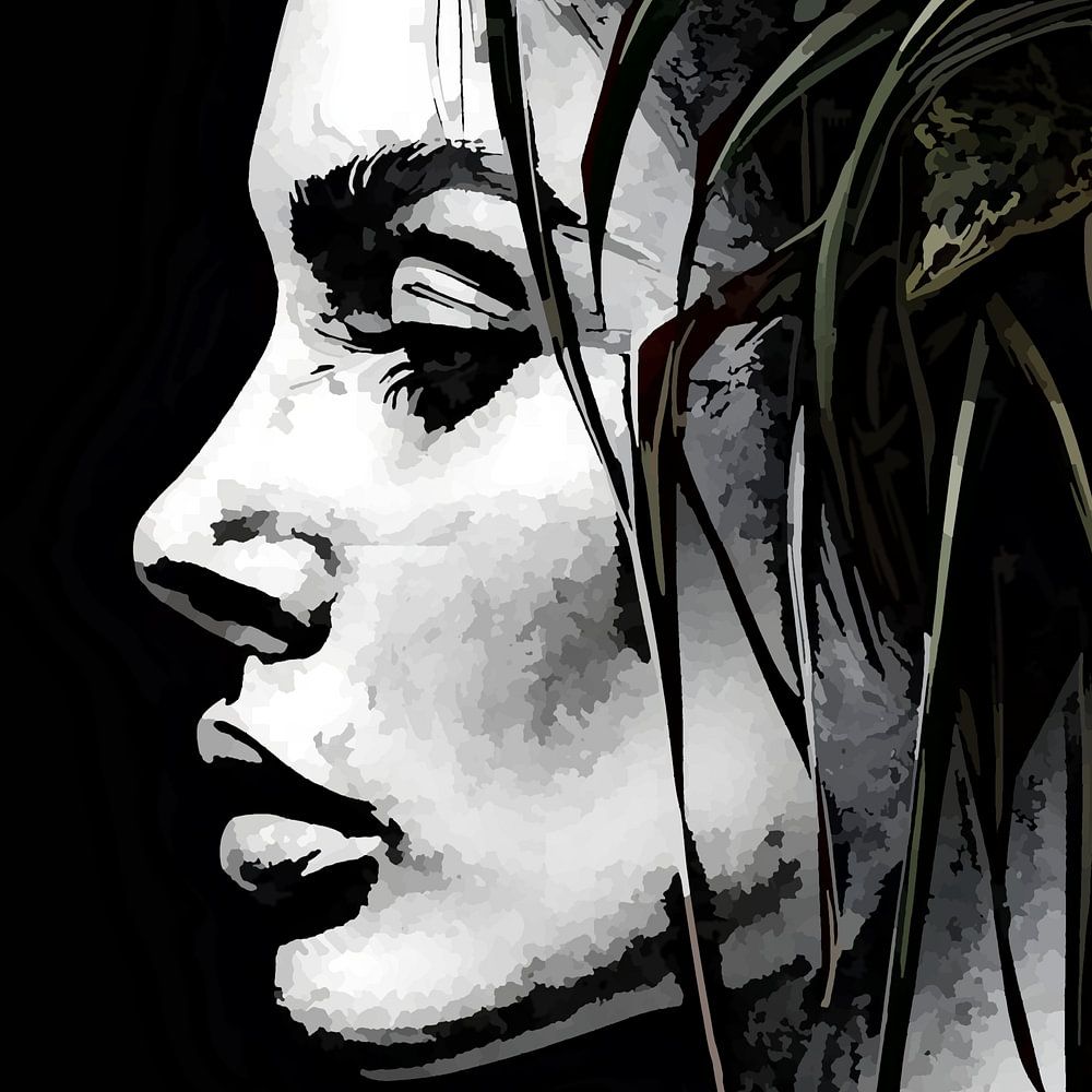 Frau, weibliches Gesicht in Schwarz und Weiß mit grünen Pflanzen im Haar