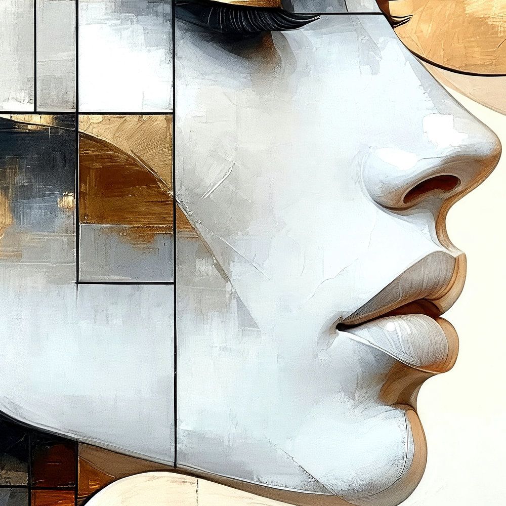 Dieses faszinierende Kunstwerk offenbart die Silhouette einer Frau im seitlichen Profil, deren anmutige Ausstrahlung durch die geschlossenen Augen und den sanften Ausdruck unterstrichen wird. Ihr Blick ist nach rechts gerichtet, voller Ruhe und Gelassenheit, als würde sie in eine innere Welt eintauchen.