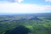 Annäherung an die Lavafelder von 2018 im Bezirk Puna auf der Big Island in Hawai'i, USA. Dieser Blick von oben, aus dem Hubschrauber, vermittelt einen hervorragenden Eindruck von den Auswirkungen und dem großen Ausmaß der vulkanischen Aktivität.